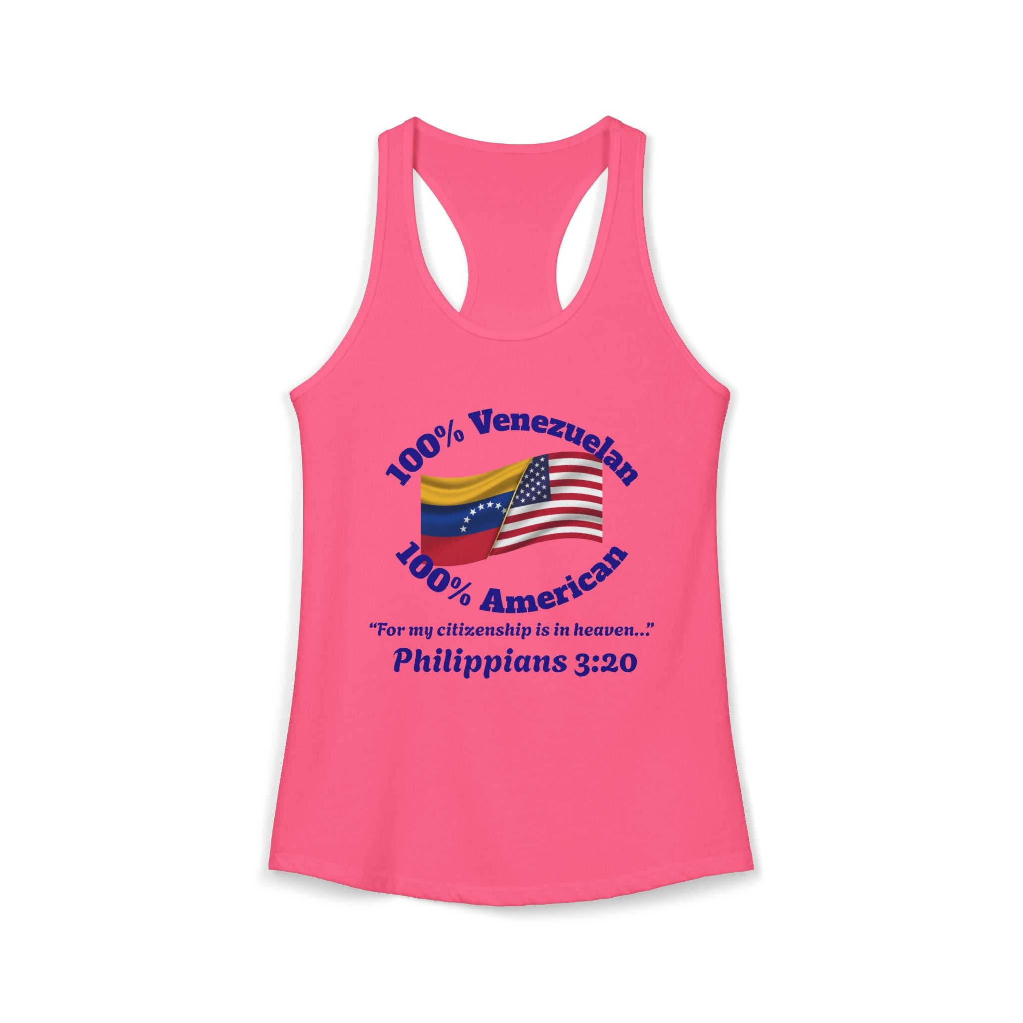 Heavenly Citizenship Racerback Tank — "Venezuelan and American but my citizenship is in Heaven" Select your size XS S M L XL 2XL Select your color Solid Hot Pink Solid Mint Solid Tahiti Blue Solid Warm Gray Solid White Heather Grey Solid Light Orange Decrease quantity for Heavenly Citizenship Racerback Tank — "Venezuelan and American but my citizenship is in Heaven" Quantity Increase quantity Show product Select size Removing from cart... Adding... Out of stock Unavailable Add to cart Removing from cart... Adding... Already in cart Select another option Regular price $15.50 Unit price / per